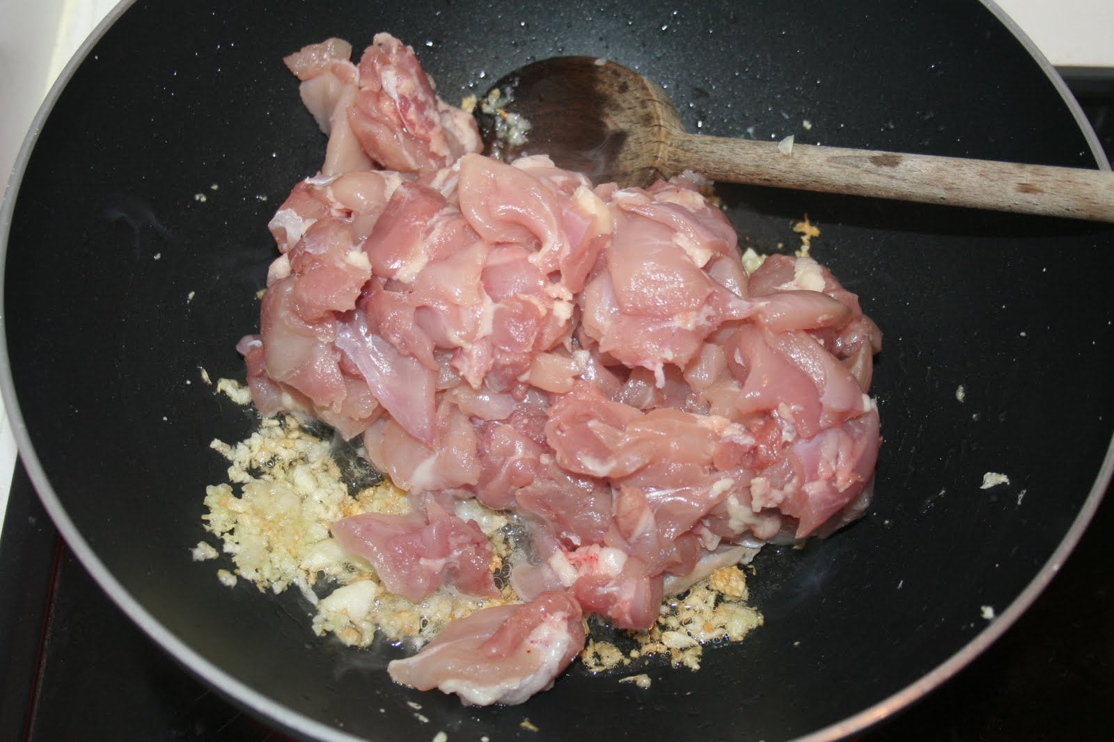 - Quand l’ail commence à sentir et à dorer légèrement, ajouter les hauts de cuisses de poulets en morceaux.