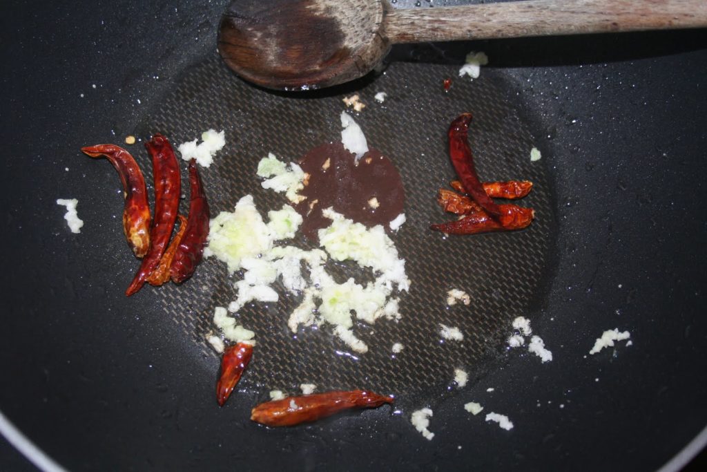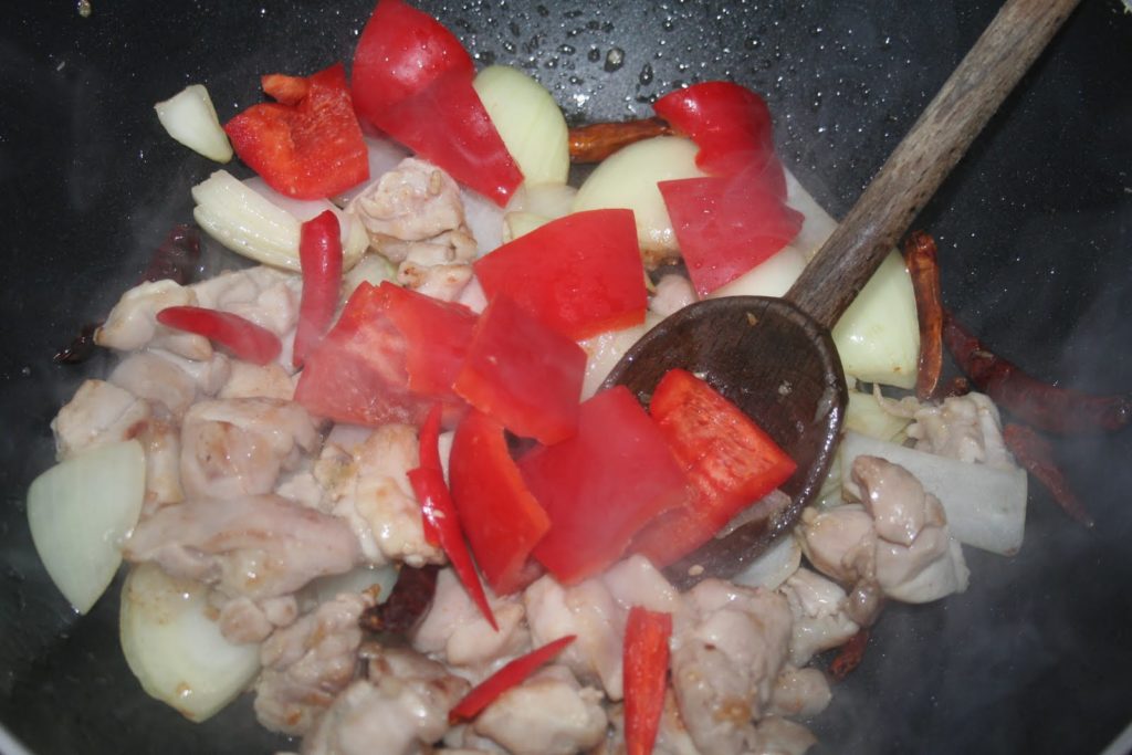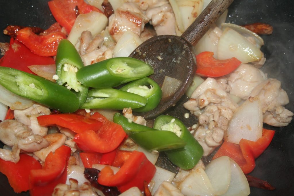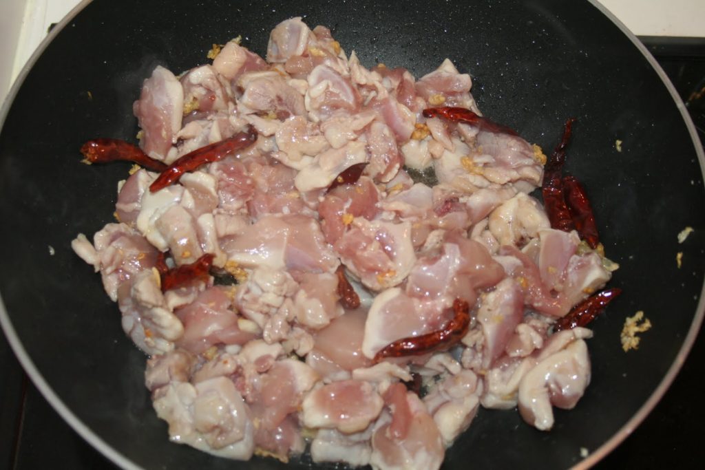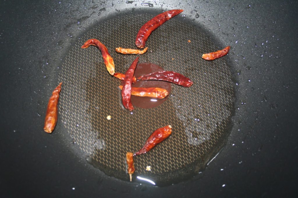 - Remettre 4 cuillerées à soupe d’huile dans le wok sur feu vif. Ajouter les piments séchés. Il y en a beaucoup sur la photo, mais on peut n’en mettre que deux.