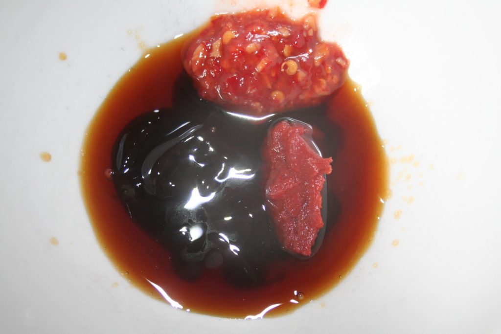 - Mettre la sauce au piment et à l’ail, la sauce d’huitre, le sucre, la sauce de poisson, la sauce de soja et le double concentré de tomate dans un bol avec l’eau et bien mélanger.