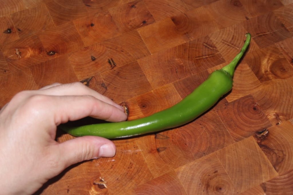 - Voici le piment vert. On peut voir qu’il est gros, et plus un piment est gros, moins il est fort. Celui-ci ne pique presque pas… Donc il suffit de le couper en tranches et de conserver les graines.