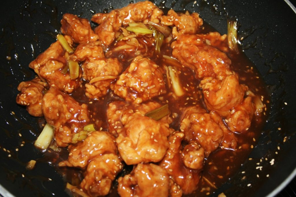 Cette recette d’apparence très chinoise, est cependant complètement inconnue en Chine. Aussi étonnant que cela puisse paraitre, elle nous vient des Etats-Unis… Mais a été inventée par un immigré chinois, Mr Peng Chang-Kuei. Cela ne l’empêche guère d’être très savoureuse. Ce sont de petits beignets de poulet, frits deux fois pour une texture croustillante, puis revenus dans une sauce acide et sucrée, pimentée si on le souhaite. Je me régale à chaque fois que je commande ce plat là-bas.