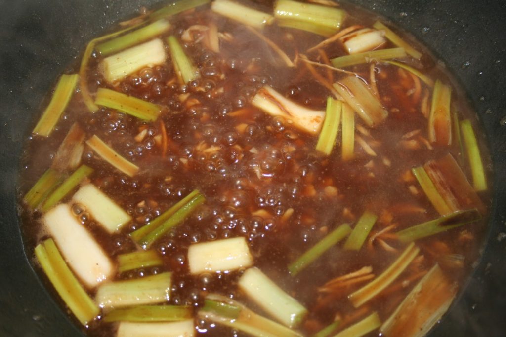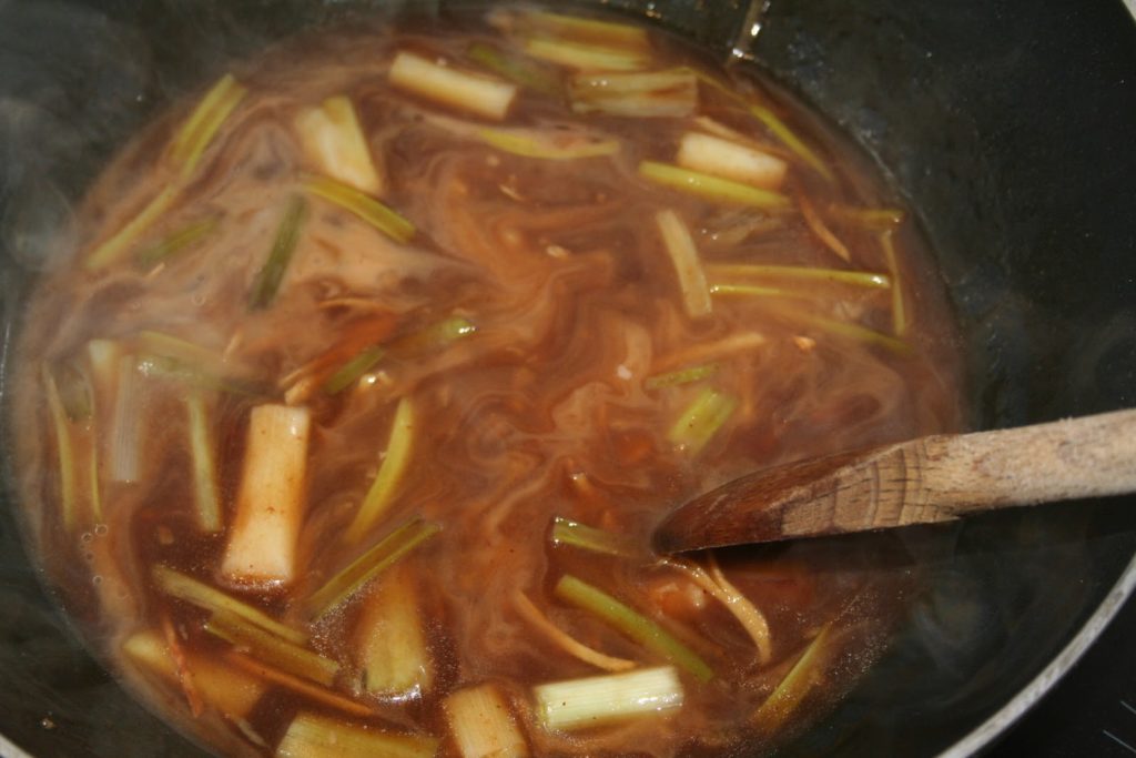Préparer le reste des ingrédients, les oignons coupés en tranches de 4cm, le gingembre en petites lanières et l’ail en petits morceaux.