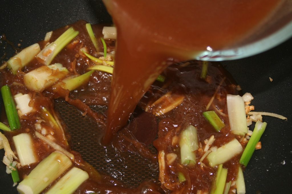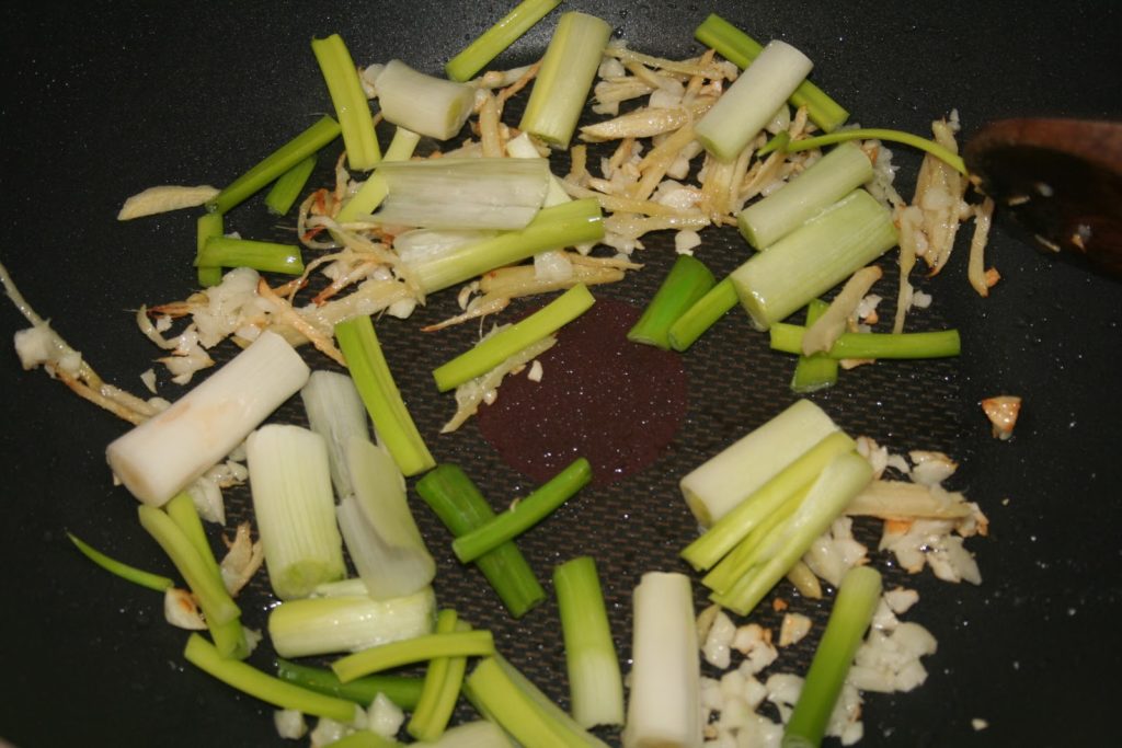 Pendant que les beignets recuisent, chauffer de l’huile dans un wok sur feu vif et faire revenir l’ail et le gingembre. C’est à ce moment qu’il faut ajouter le piment séché si on le souhaite.