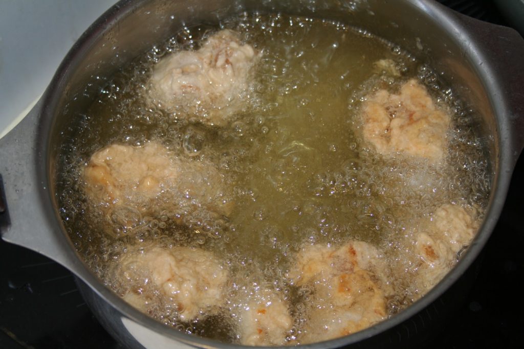 - Quand tout le poulet est cuit, remettre l’huile sur feu cette fois assez vif. L’huile doit être bien chaude. Replonger les morceaux de poulet pour qu’ils soient cette fois complètement dorés. Plus ils seront dorés, puis ils resteront croustillants longtemps avec la sauce. Le haut de cuisse ne craint pas la cuisson prolongée, on peut donc vraiment bien cuire ces petits beignets.