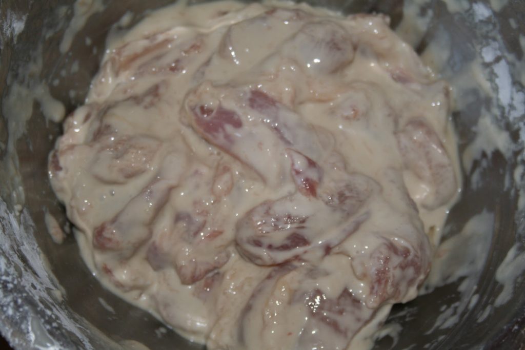 Quand tout le poulet est cuit, remettre l’huile sur feu cette fois assez vif. L’huile doit être bien chaude. Replonger les morceaux de poulet pour qu’ils soient cette fois complètement dorés. Plus ils seront dorés, puis ils resteront croustillants longtemps avec la sauce. Le haut de cuisse ne craint pas la cuisson prolongée, on peut donc vraiment bien cuire ces petits beignets.