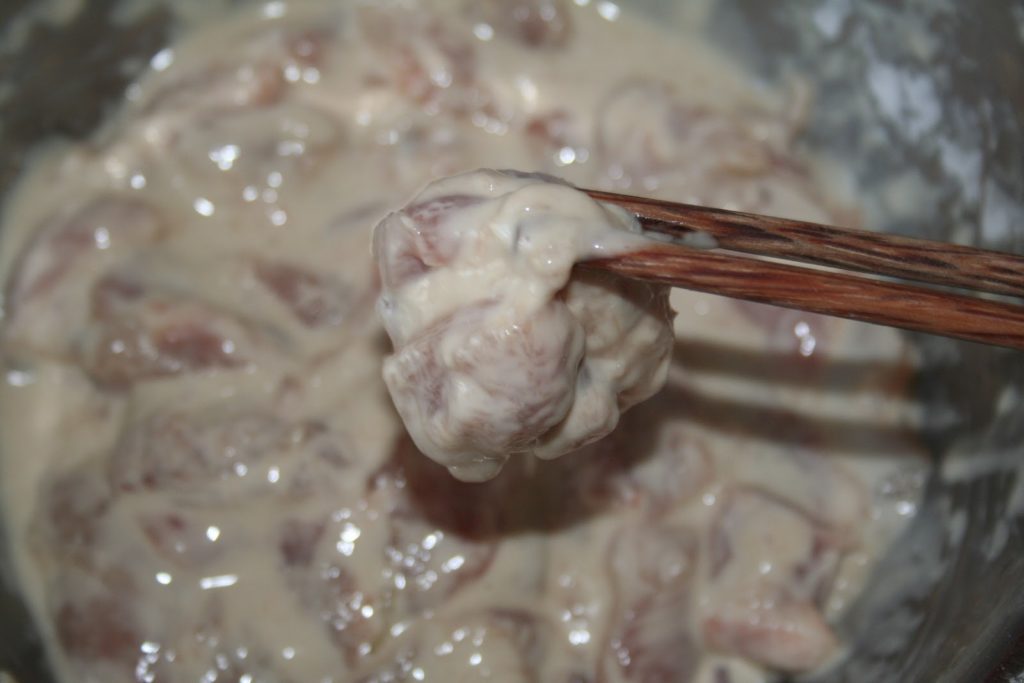 - Quand l’huile est prête, ajouter la moitié des morceaux de poulet, un par un.