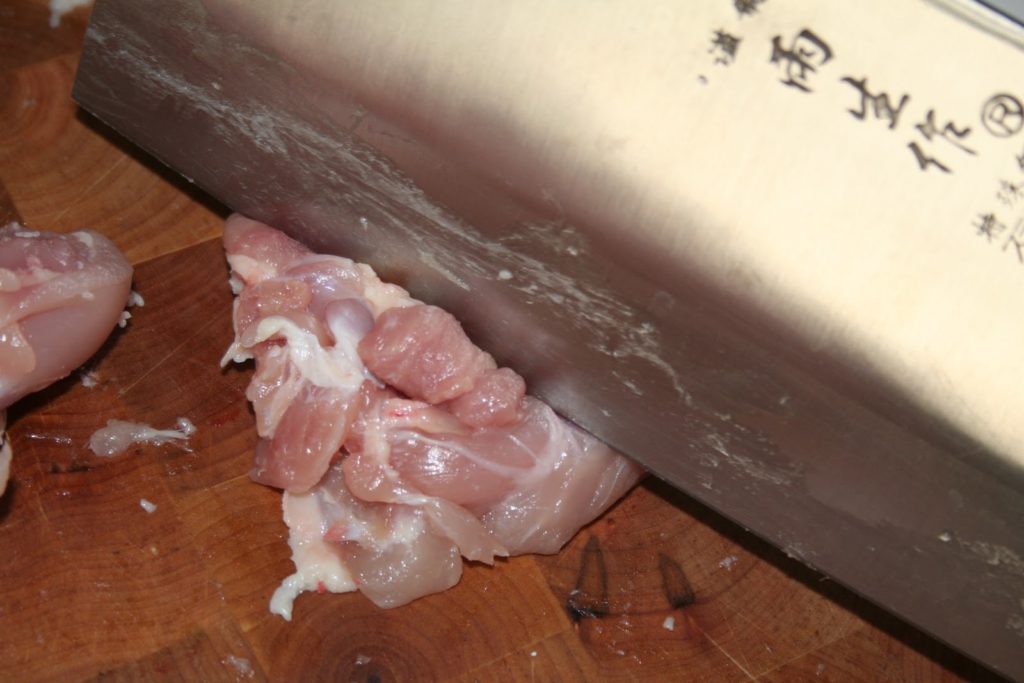 - Préparer le poulet. Surtout ne pas prendre de blanc, car cela donnera une viande sèche et sans goût. Désosser et enlever la peau.