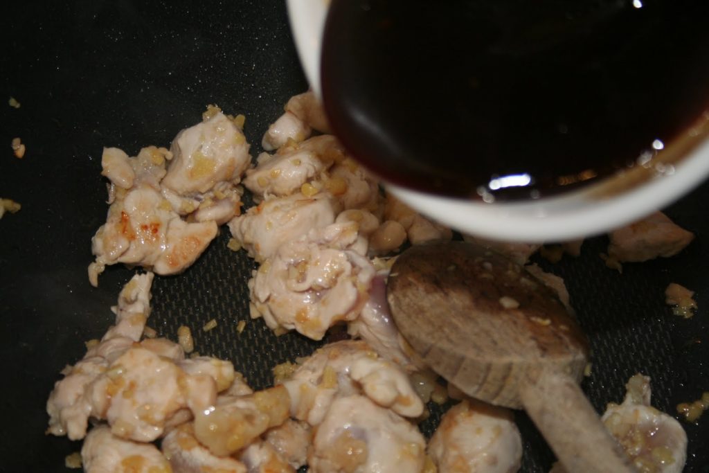 - Ajouter la sauce soja/huitre/teriyaki/prune quand le poulet commence à avoir toutes ses faces cuites!