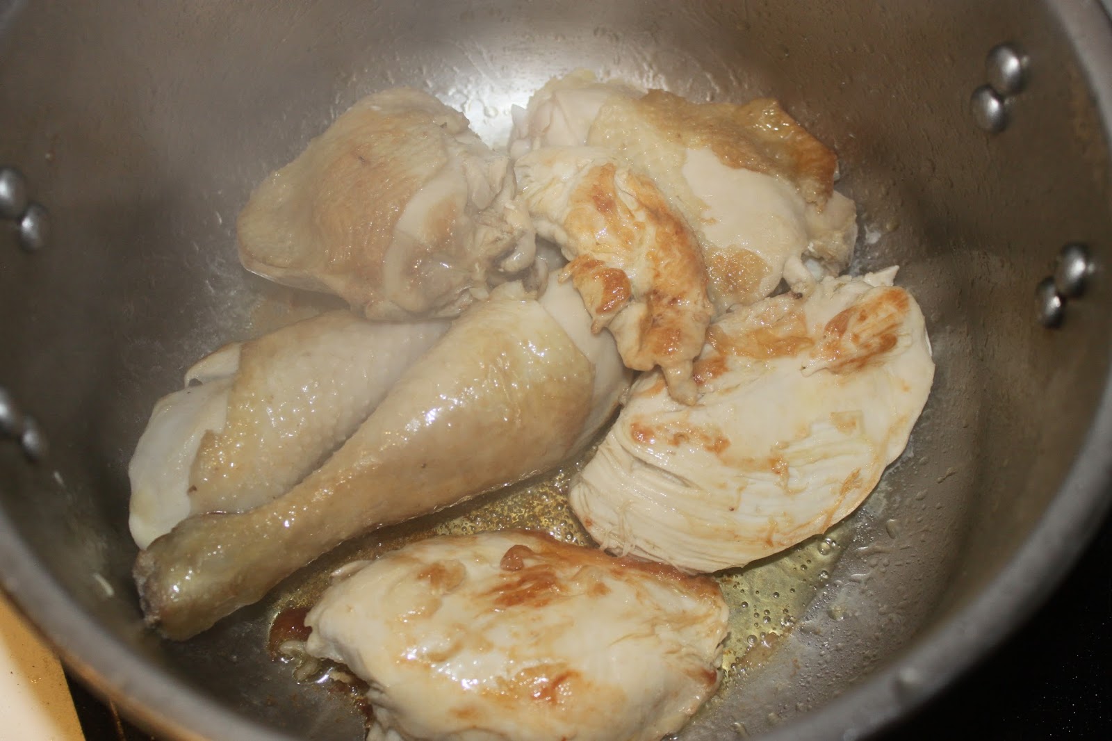 - Remettez le poulet. J’enlève à ce moment la plupart de la peau, sinon le plat devient trop gras. J’en laisse sur un morceau de haut de cuisse par exemple.