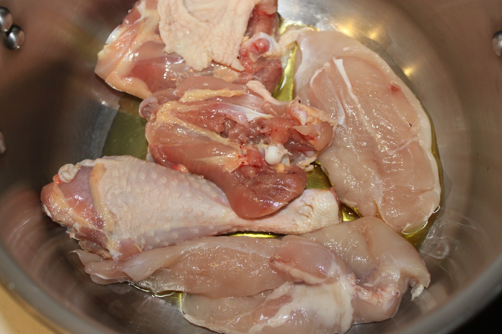 - Faites chauffer une cocotte sur feu modéré avec l’huile d’olive. Ajoutez le poulet.