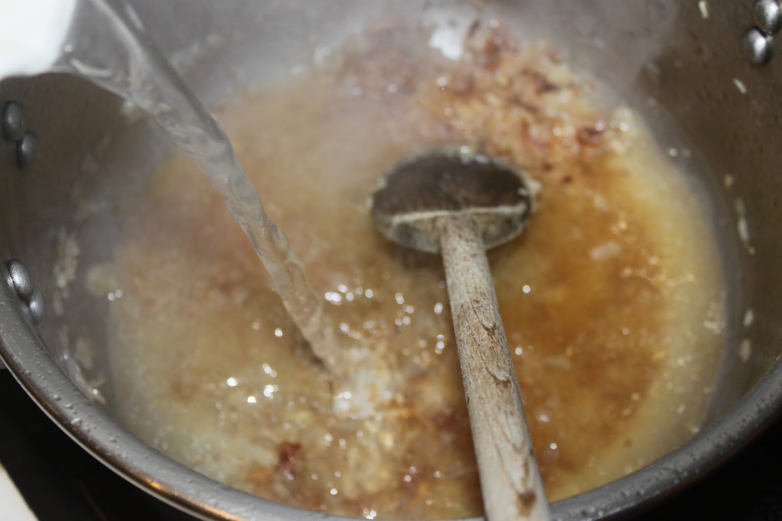 Remuez régulièrement pendant deux ou trois minutes puis ajoutez le vin et le bouillon de poule.