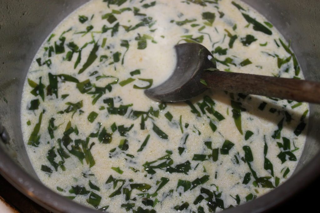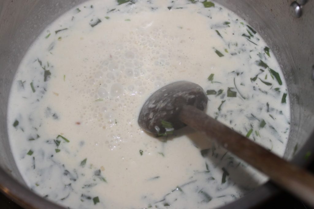- Versez la crème entière.Note de Bernard: si vous préférez ne pas mettre de crème, il faudra dans ce cas ajouter une cuillerée à soupe de farine dans les échalotes avant de verser le bouillon et le vin. Sinon la sauce sera liquide comme de l’eau !