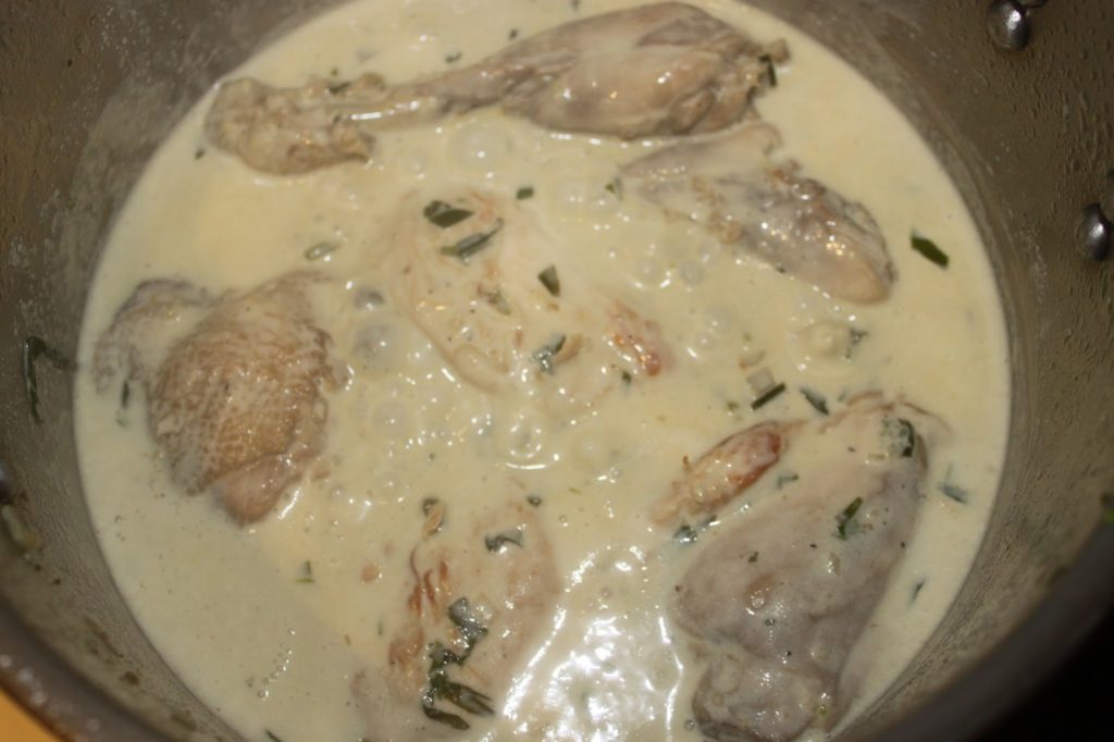 - Faites cuire sur modéré pendant vingt à trente minutes. Vérifiez bien la cuisson du poulet. Quand il est cuit, enlevez-le du bouillon et mettez-le de côté dans une assiette.Laissez maintenant réduire le bouillon de moitié. Cela peut prendre un peu de temps.Hachez grossièrement l’estragon.