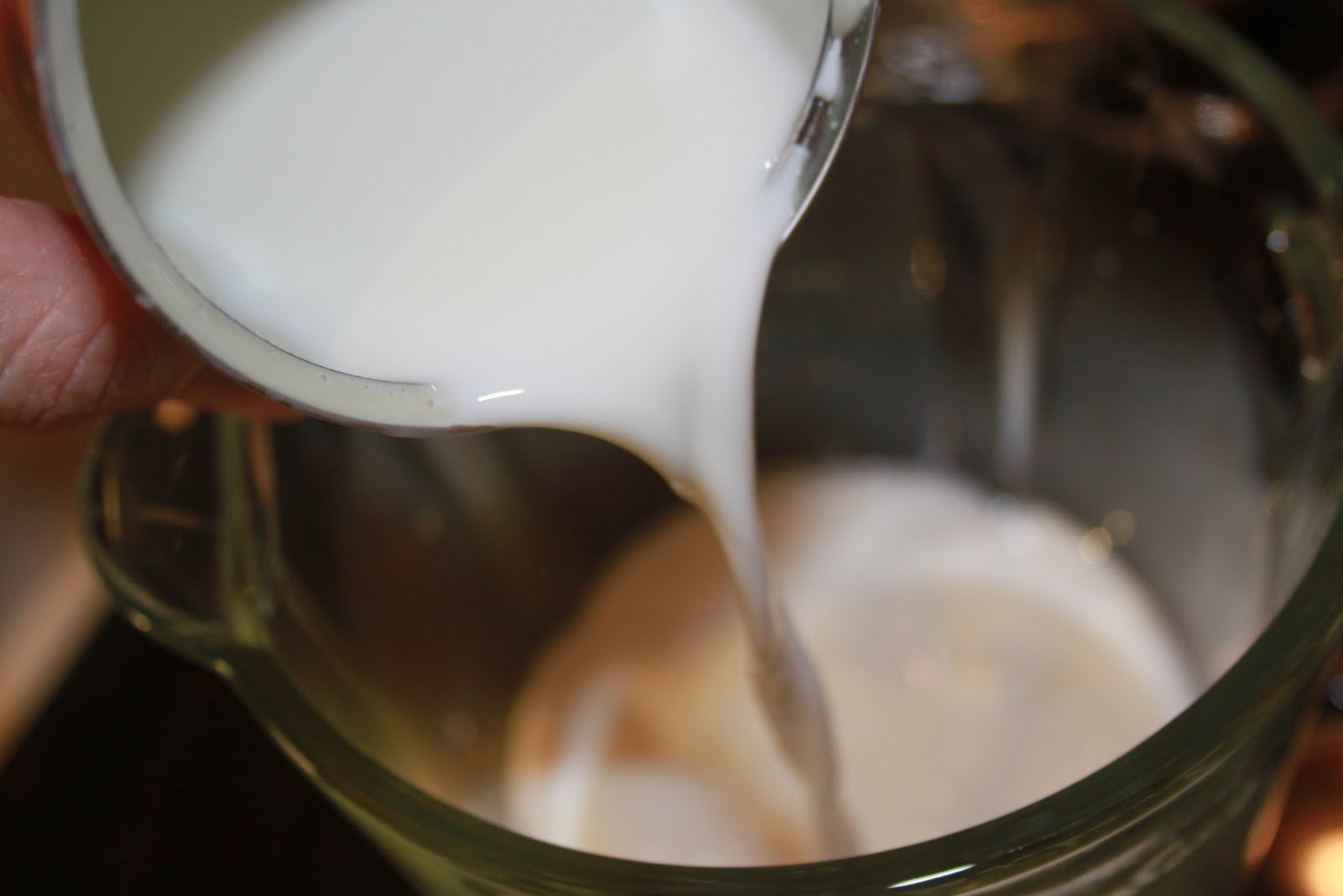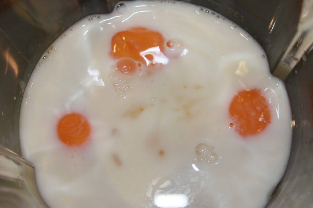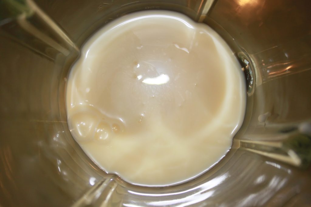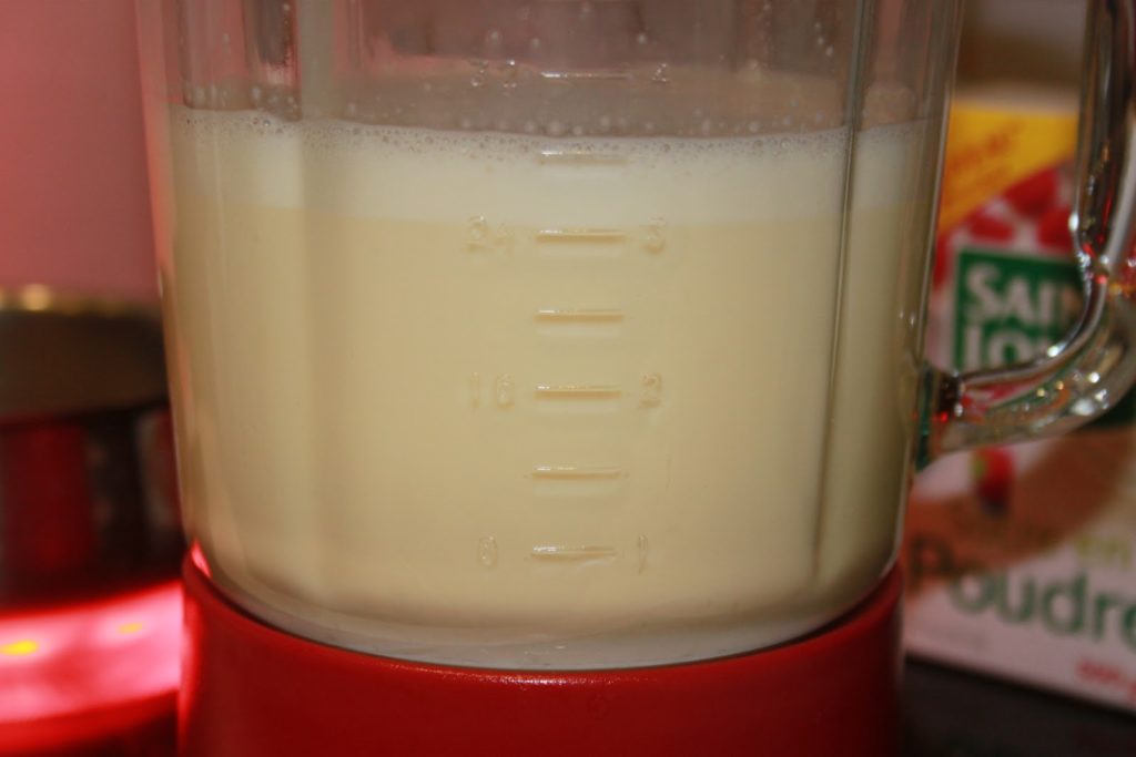 Remplir les deux boites vides avec du lait demi-écrémé et verser dans le blender. on a donc la même quantité de lait concentré sucré et de lait demi-écrémé.