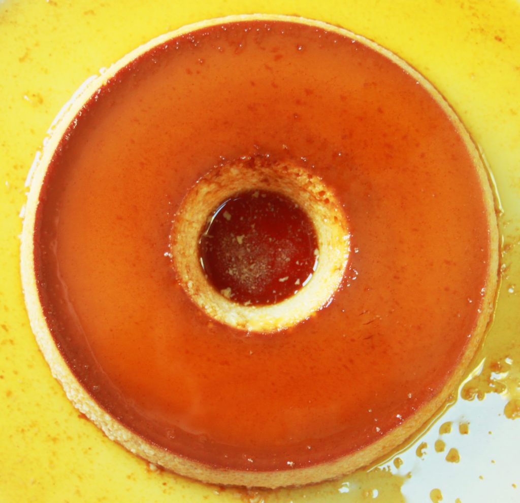 Quand le caramel est prêt, le verser dans un moule (avec un trou au milieu, ce sera le top de la tradition!).