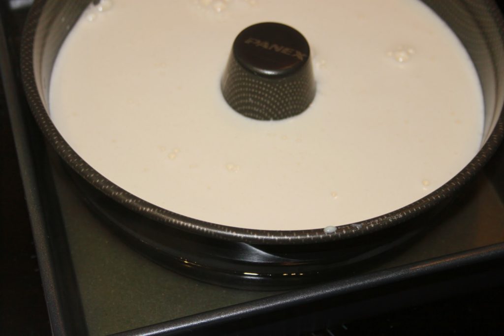 - Verser dans le moule sur le caramel. Mettre le moule dans un plat allant au four et remplir ce plat d’eau bouillante. Le moule doit être immergé à moitié au moins.