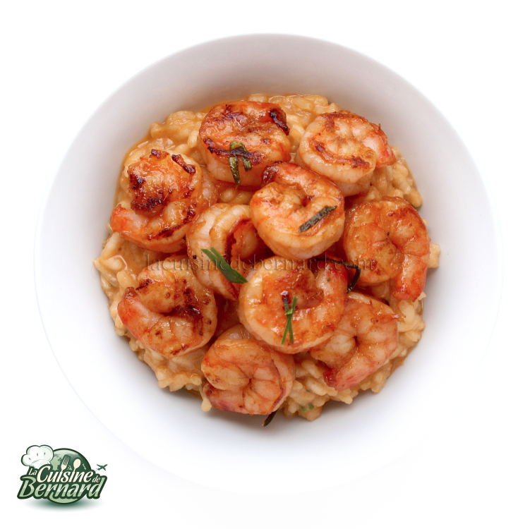 - Versez le risotto dans 4 assiettes puis ajoutez 10 crevettes cuites et servez sans attendre !