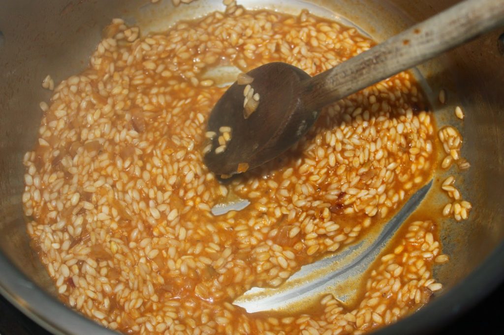 - Mélangez bien dans le gras pour qu’il devienne nacré. Versez alors un peu de bouillon de légumes (sur le litre).