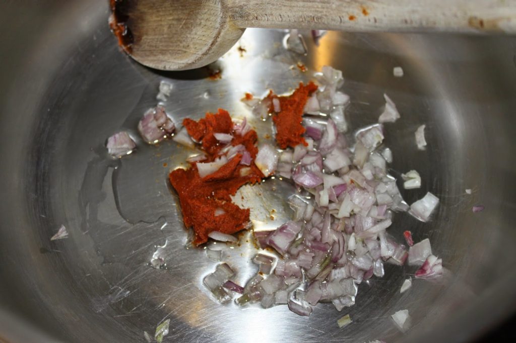 - Pour le risotto: mettez l’échalote finement hachée, l’huile et la pâte de curry rouge dans une large casserole sur feu modéré.