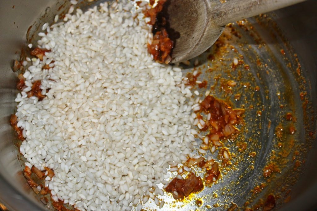 - Faites revenir une minute ou deux puis ajoutez le riz.