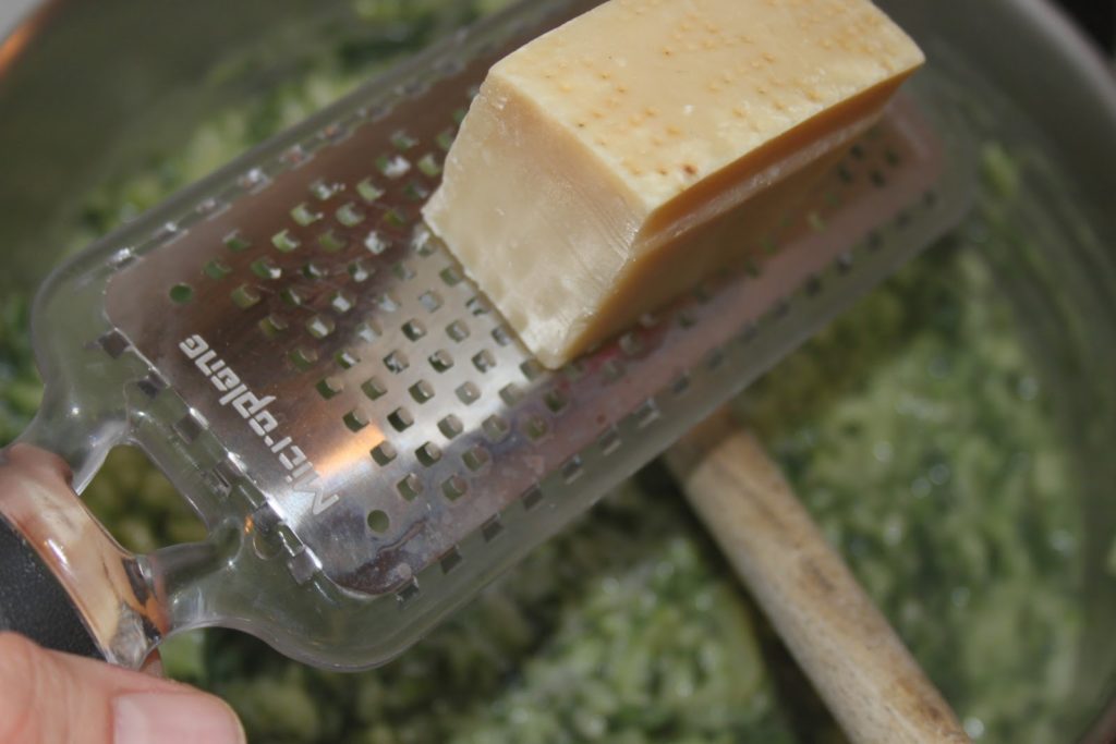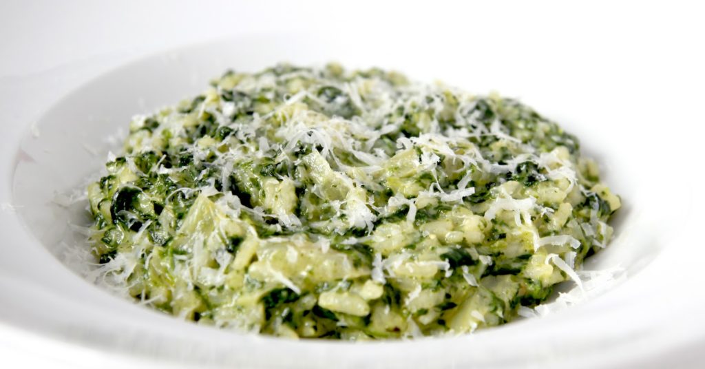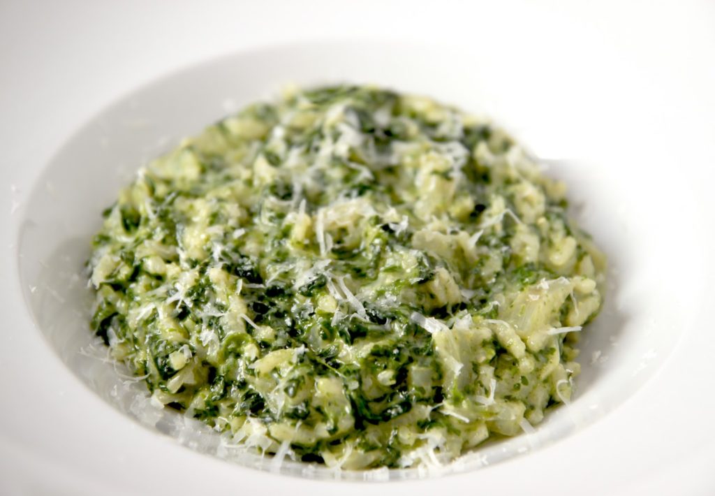 -300g de riz à risotto (au choix!) -1 litre de bouillon de légumes -2 cubes « or » -1 oignon -15cl de vin blanc doux -2 cuillerées à soupe d’huile d’olive -40g de beurre salé -500g d’épinards -125g de mascarpone -40g de parmesan frais râpé