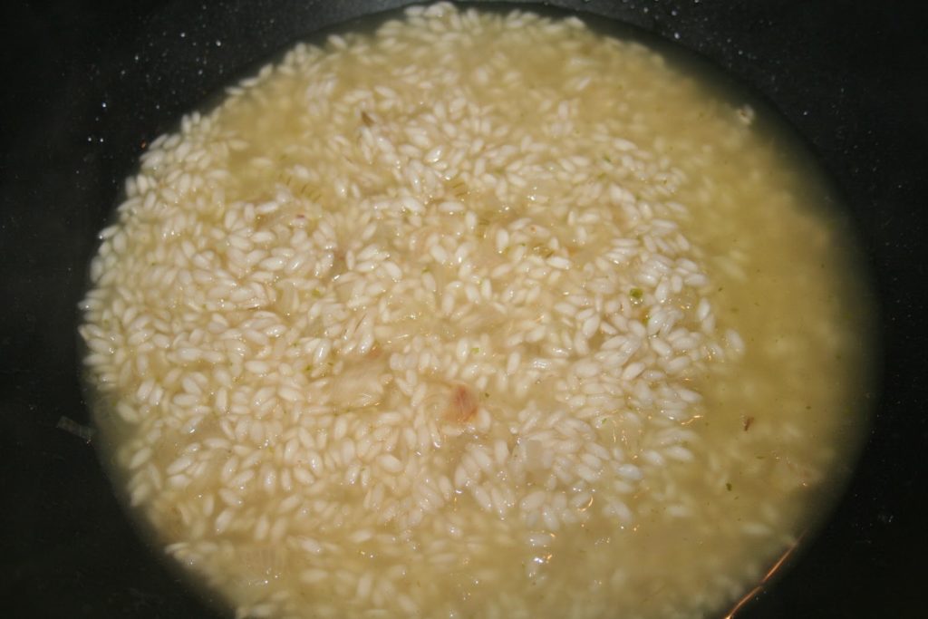 Ajouter le vin blanc et laisser le riz l’absorber toujours sur feu doux. Note de Bernard: pour cette recette, je n’avais plus de vin blanc sec à la maison. J’ai pris un fond de Pineau des Charentes que j’avais au frais. Le résultat était vraiment excellent, le risotto prenant une petite note douce…