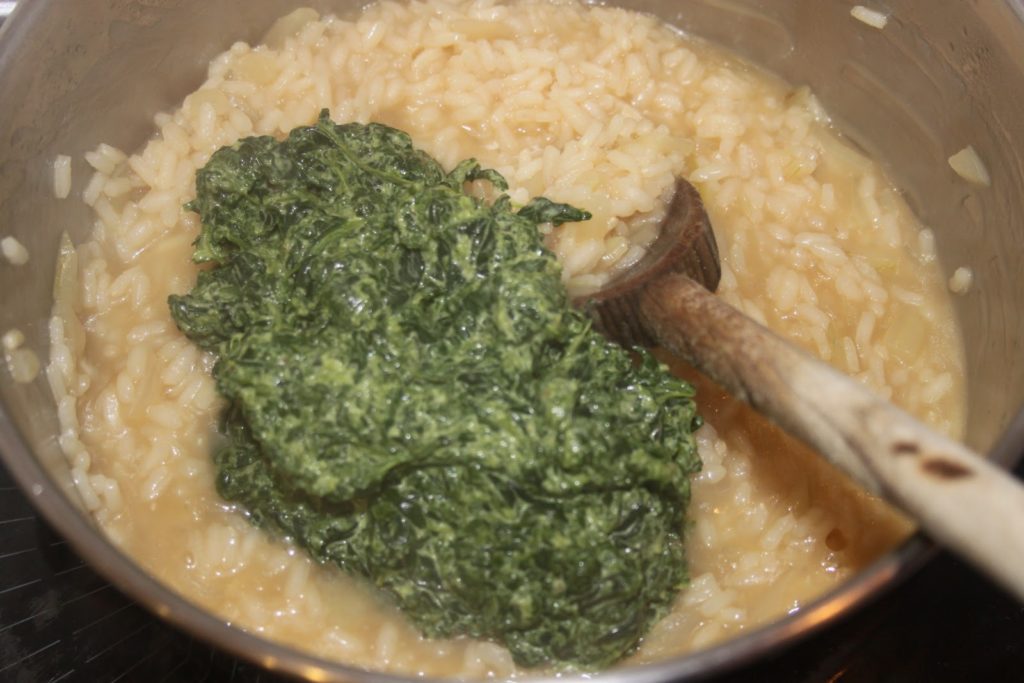 Lorsque tout le bouillon est absorbé, ajouter les épinards à la crème. On n’est pas obligé de tout mettre, on peut en mettre petit à petit jusqu’à ce que le risotto ait l’aspect et le goût recherché. Pour ma part, j’ai presque tout mis!