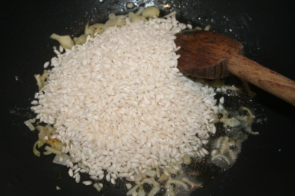 Préparer le risotto: Commencer par couper finement l’oignon. Le faire revenir sur feu doux dans l’huile d’olive. Quand il devient transparent, ajouter le riz et l’enrober de matière grasse (le nacrer!).