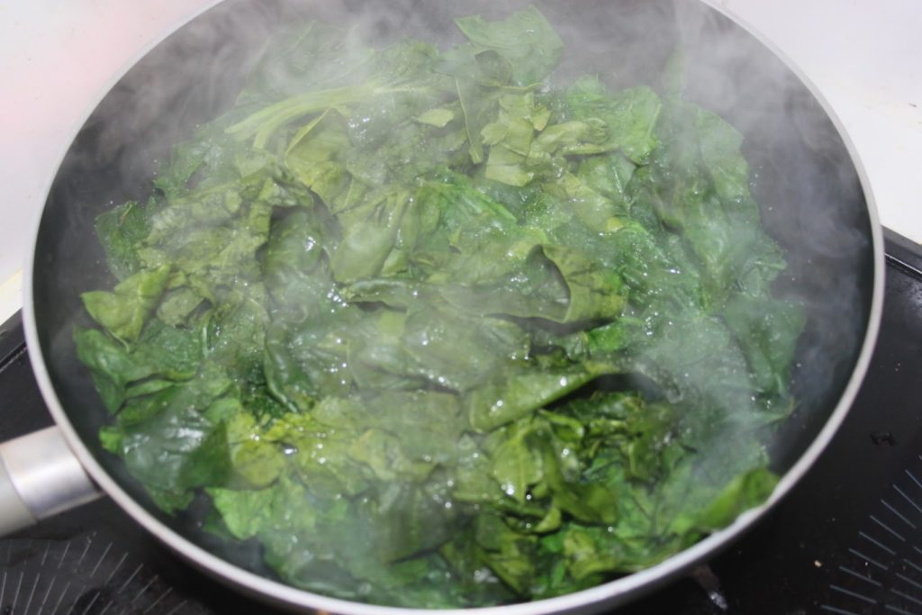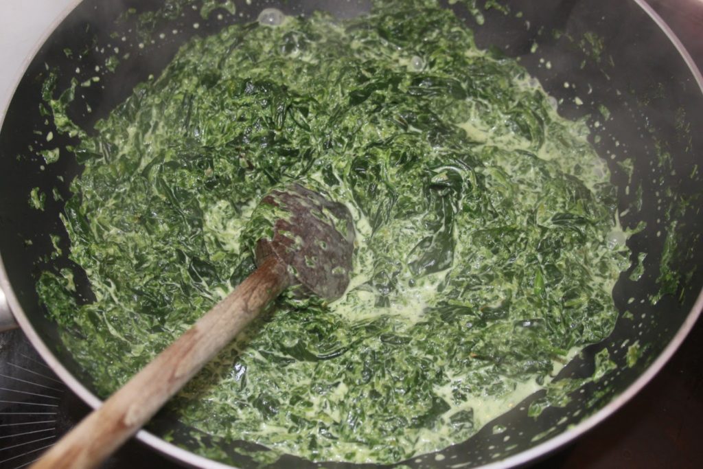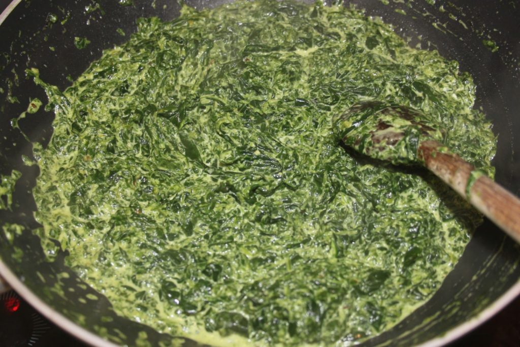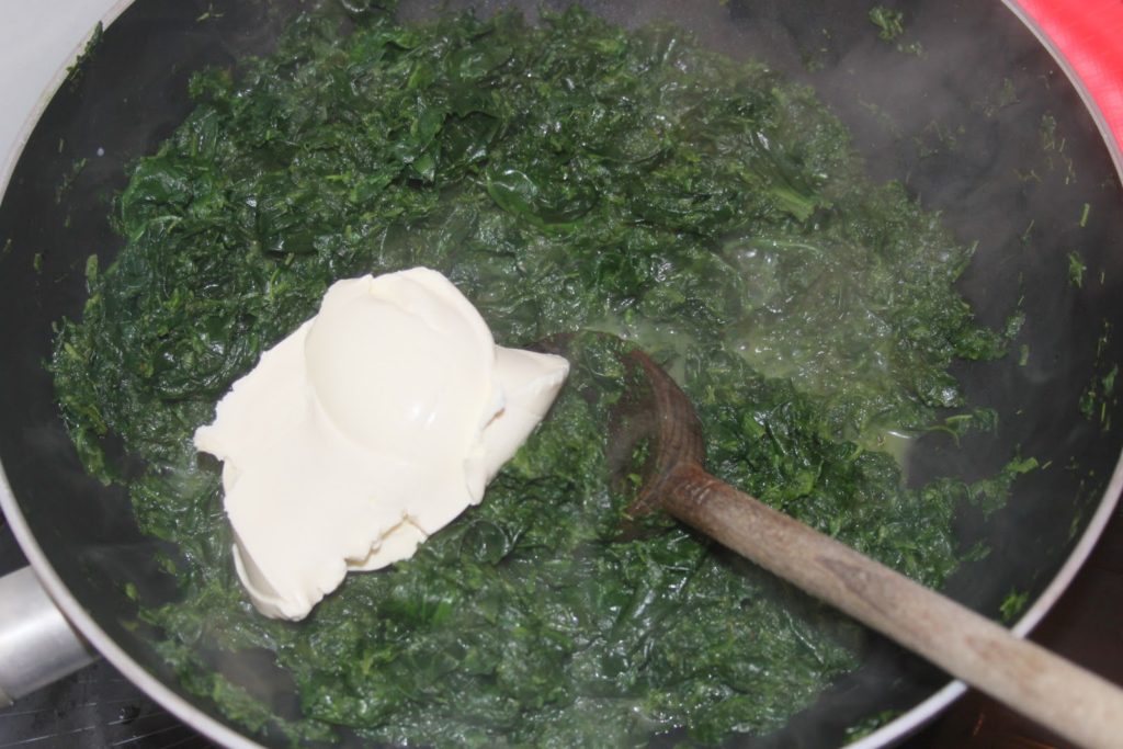 Les épinards sont à ce stade délicieux, mais je laisse cuire un peu plus, jusqu’à ce que le mascarpone soit « absorbé » par les épinards. En prenant une cuillerée d’épinards, on voit si la crème s’évade ou si les épinards et la crème forment un tout. À ce moment, c’est cuit!! Arrêter la cuisson et mettre de côté.