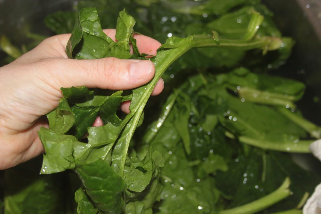 Enlever la nervure centrale des feuilles. Bien essorer (dans une centrifugeuse à salade).