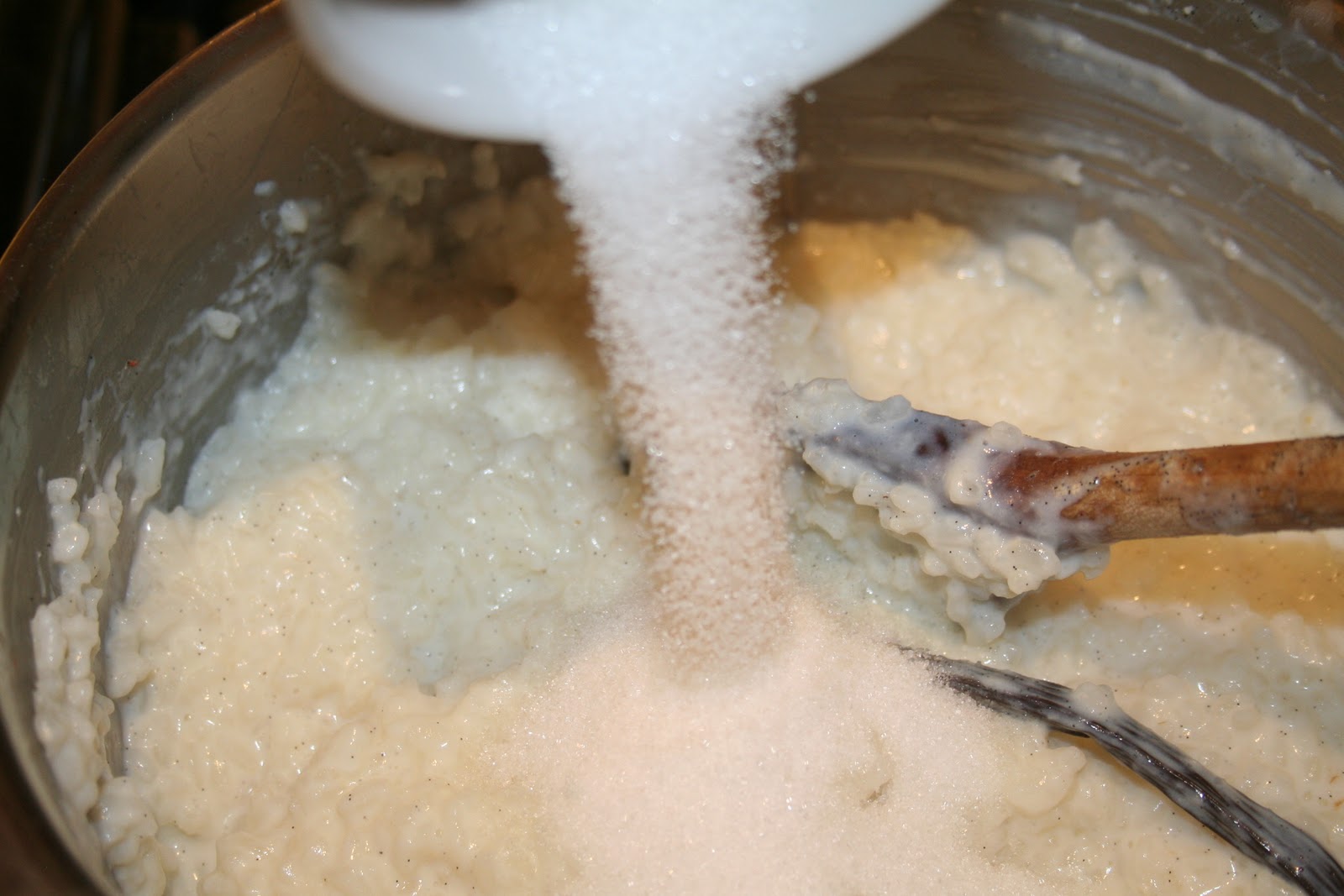 - Quand le lait est presque complétement absorbé, ajoutez le sucre.