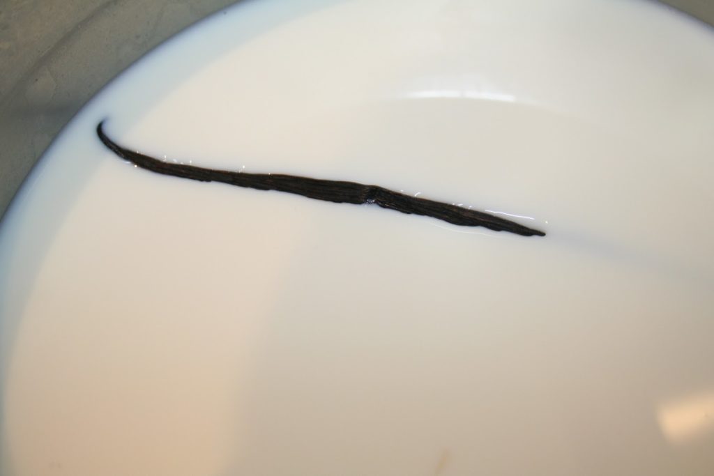 - Ajoutez la gousse de vanille fendue en deux et grattée, vanilline vidée dans le lait.