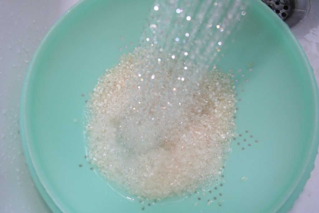 - Lavez le riz à grande eau en le mettant dans ne passoire fine pour que les grains n s’échappent pas.