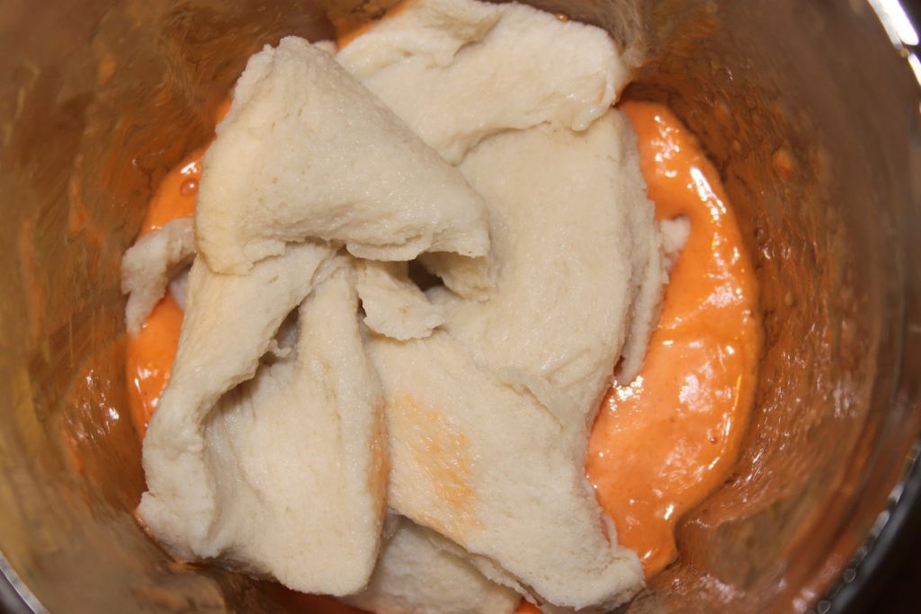 - Mixer et ajouter le pain de mie trempé dans un peu d’eau et essoré.