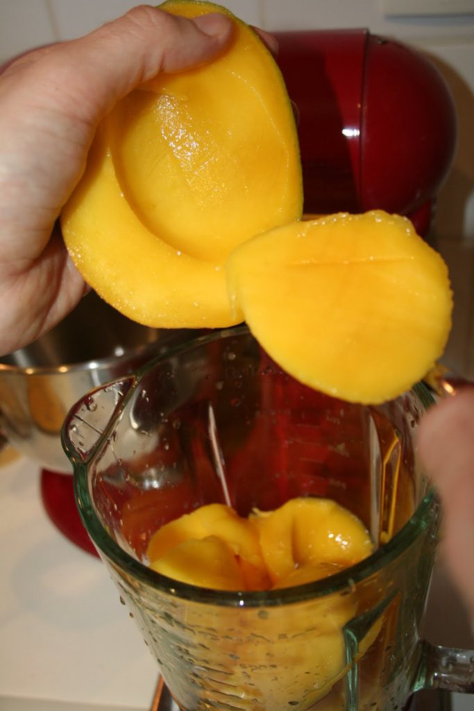 - Couper de chaque côté du noyau les mangues et prélever la chair directement à la cuiller, puis tout ce qui reste autour des noyaux. Placer cette chair dans un blender avec le sirop de canne à sucre et le jus de citron.
