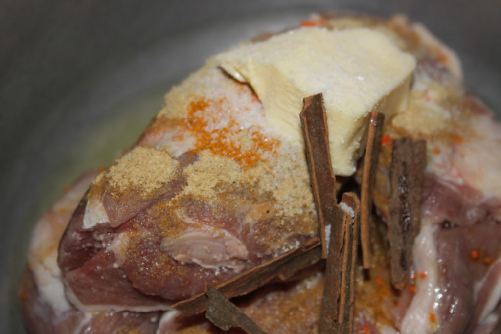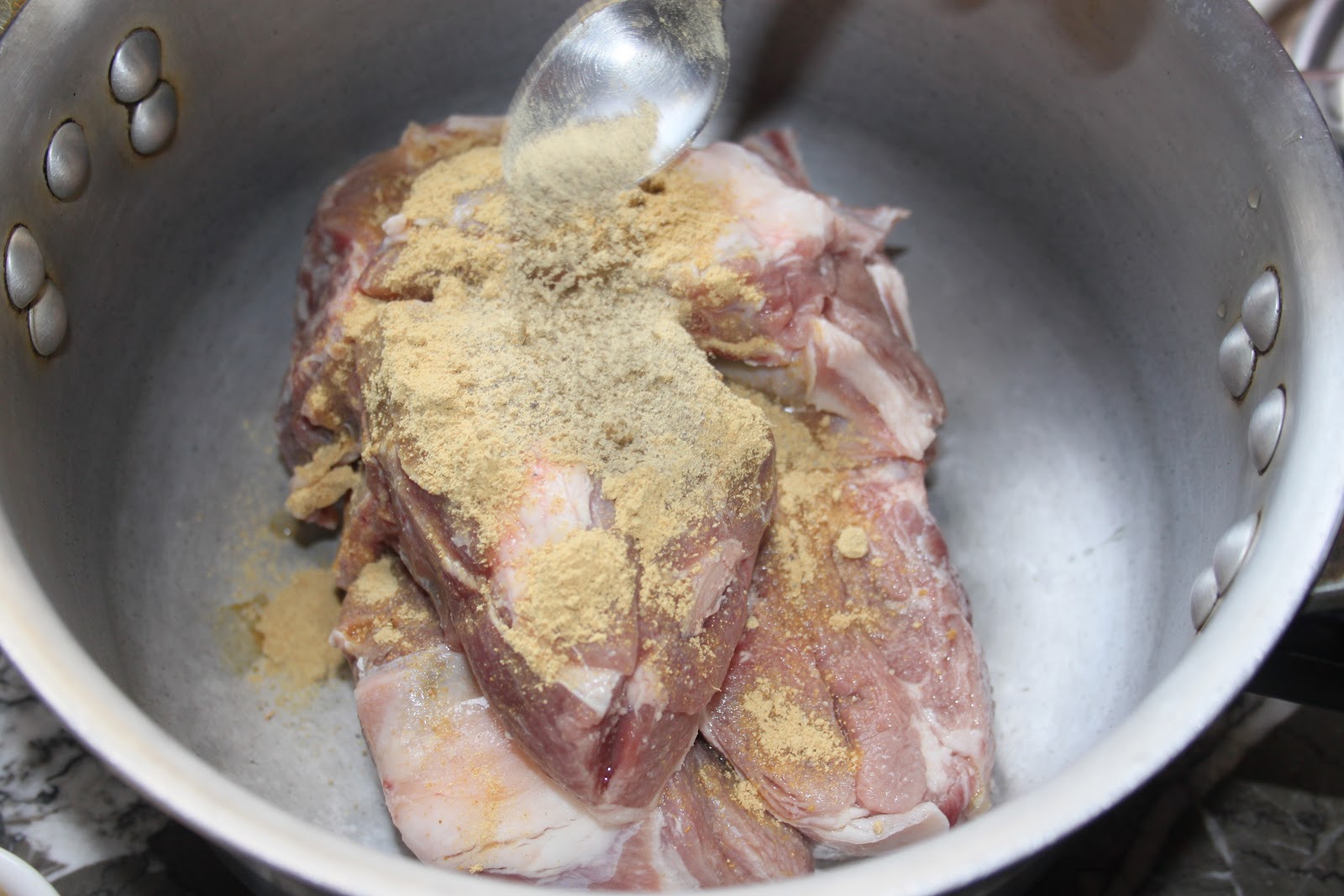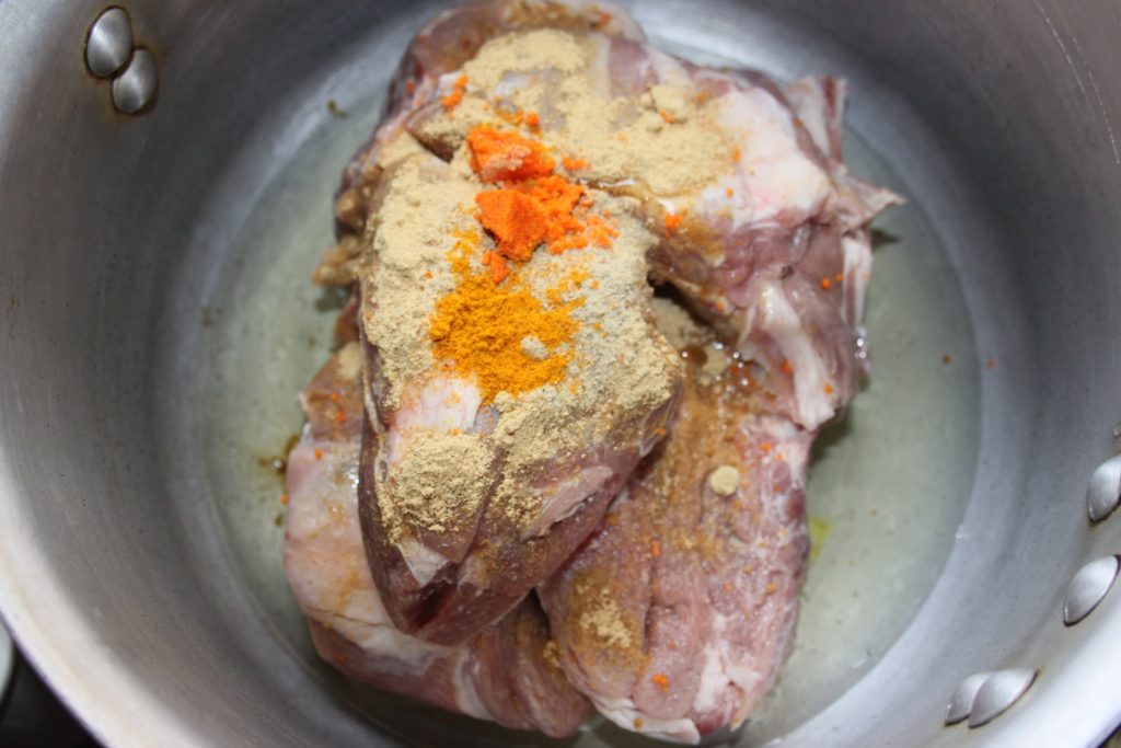 - Mettre la viande dans une cocotte minute (ou un grande casserole ou même un tajine allant sur le feu!). Ajouter les épices: gingembre en poudre, poivre…