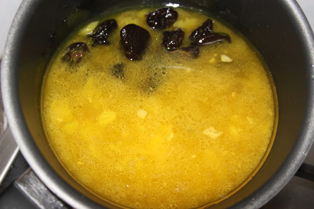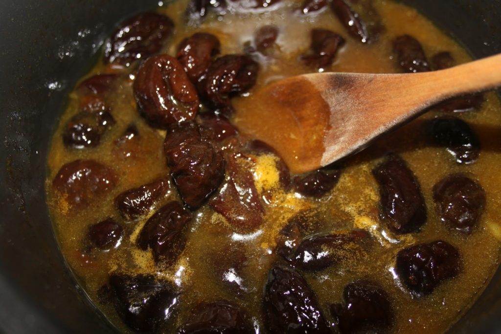 - Prélever un peu de jus de cuisson et le mettre dans une casserole avec les pruneaux. Ils cuiront donc à part pour éviter de les réduire en purée dans le tajine!