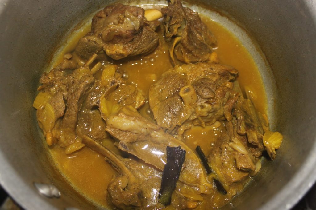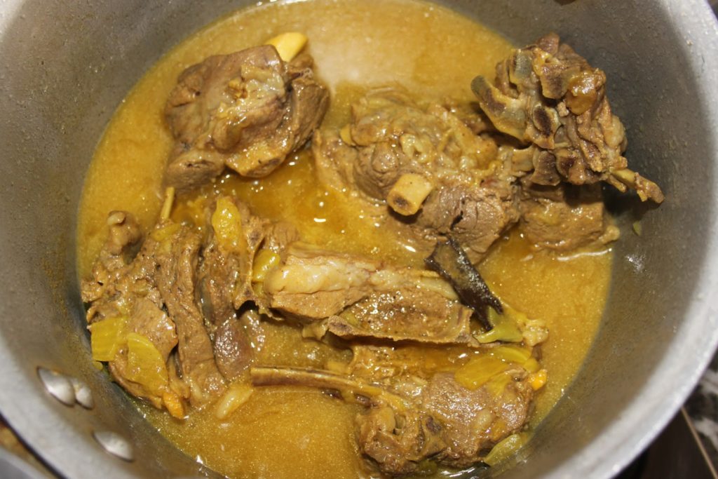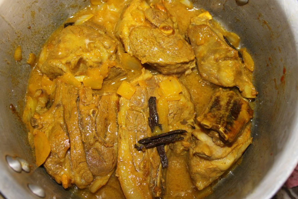 Puis cuire une bonne heure (voir 1h30) à la cocotte minute. Si l’on n’a pas de cocotte, il faudra bien fermer le couvercle du plat utilisé et prolonger la cuisson (trois heures voir plus!). La viande doit se détacher de l’os! Il faut surveiller de temps en temps et ajouter au besoin un peu d’eau.