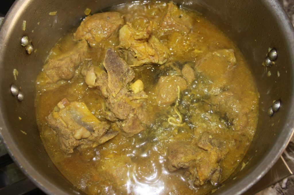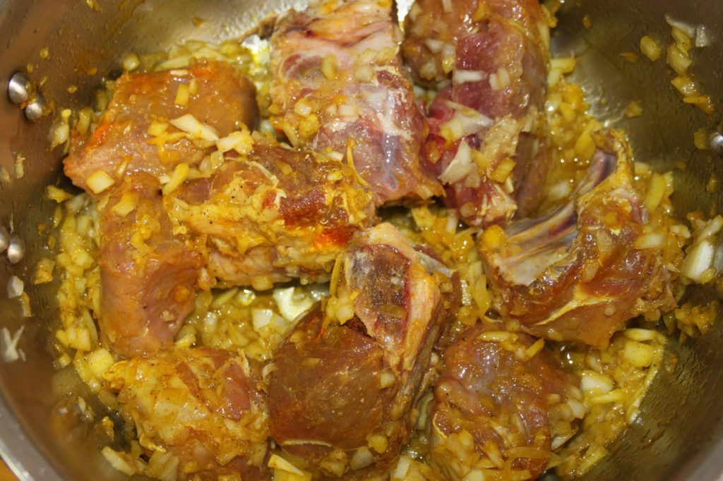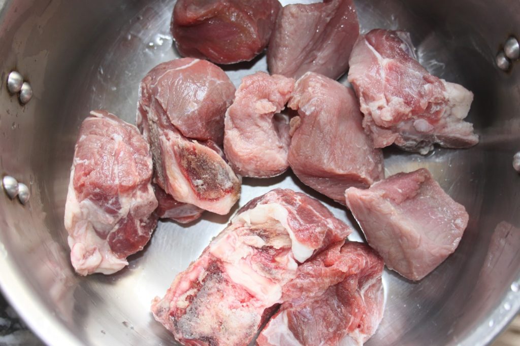 - Mettre la viande coupée (il suffit de demander au boucher de couper en morceaux, surtout pour les os) dans une cocotte avec l’huile (pas l’huile d’olive).