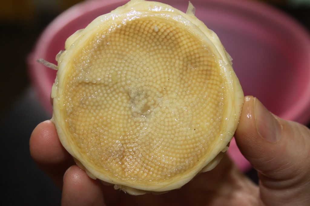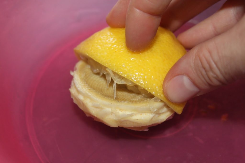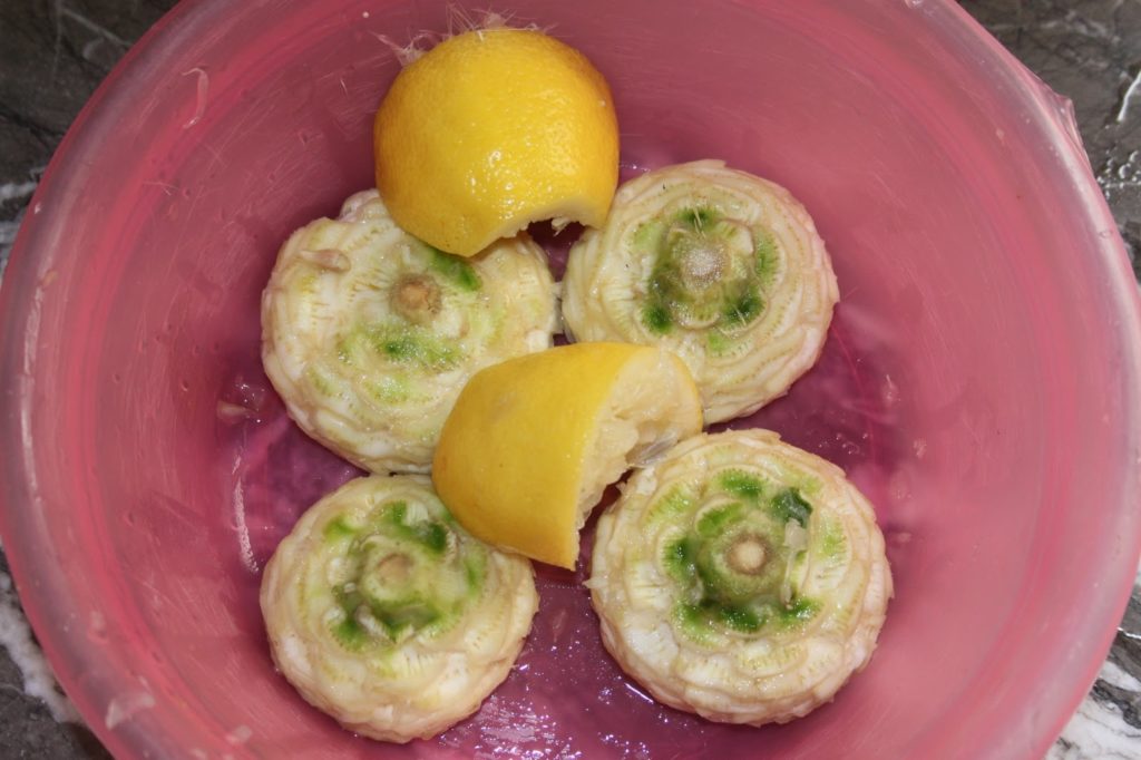 - Couper la tige, puis enlever les feuilles avec un couteau en coupant à ras du fond. Enlever ensuite le « foin ». Il faut passer tout de suite du citron sur les mains et le fond d’artichaut pour éviter le noircissement.
