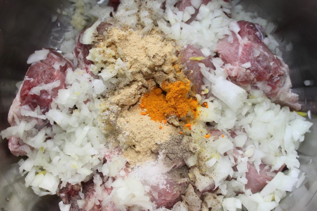 - Ajouter l’oignon haché finement, le sel, le poivre noir, le curcuma, le gingembre en poudre et le colorant safran.