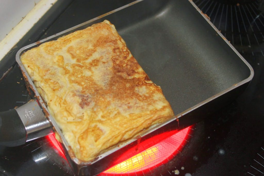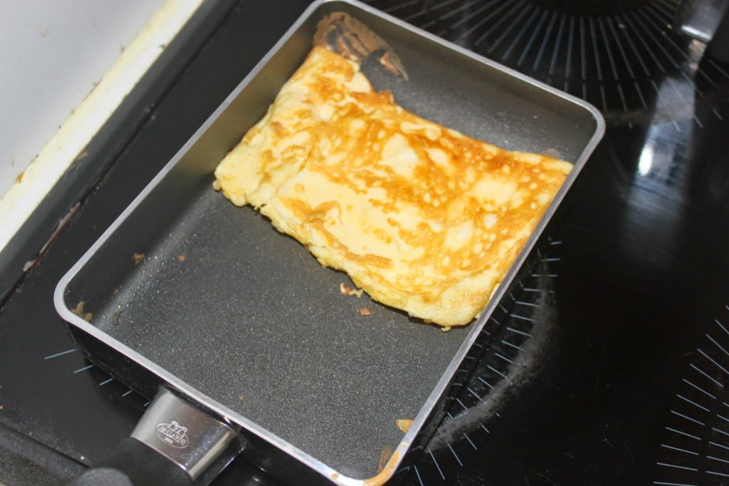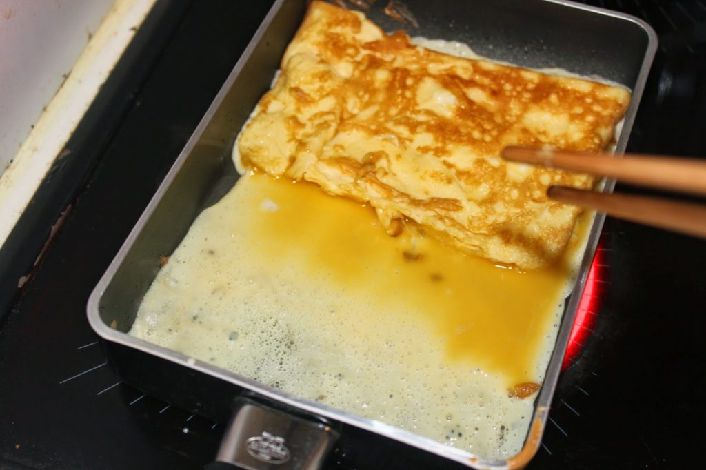 - Faites cela jusqu’à ce qu’il n’y plus d’omelette. Une fois terminé, faites glisser le tamagoyaki sur une assiette.