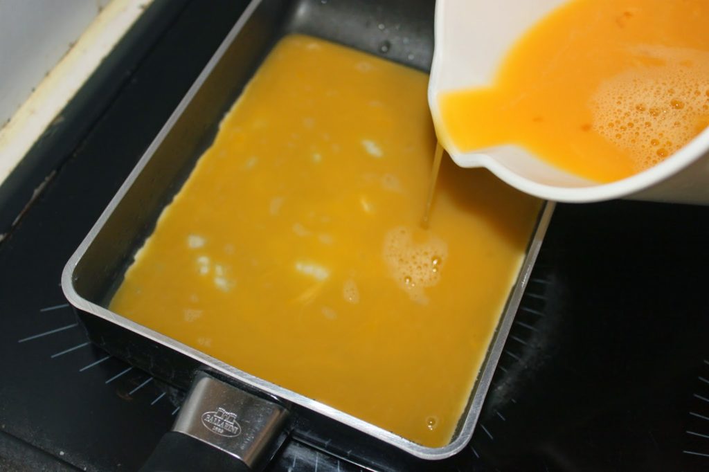 Voici la poêle à tamagoyaki. Vous la trouverez sur internet ou toujours dans les supermarchés japonais. Huilez-la légèrement.