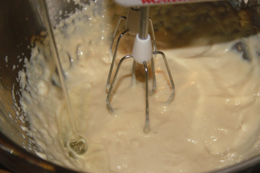- Mélanger à basse vitesse au fouet électrique pendant 2 minutes, pour bien défaire les protéines du jaunes d’oeuf et du lait.