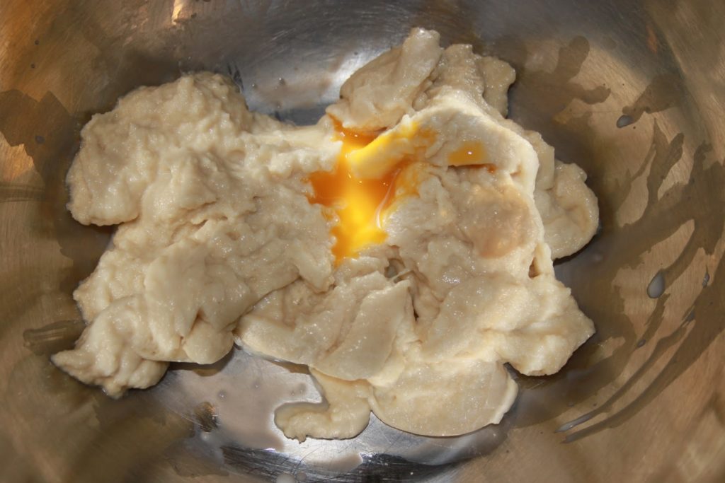 - Ajouter les oeufs (sans la peau de la poche).