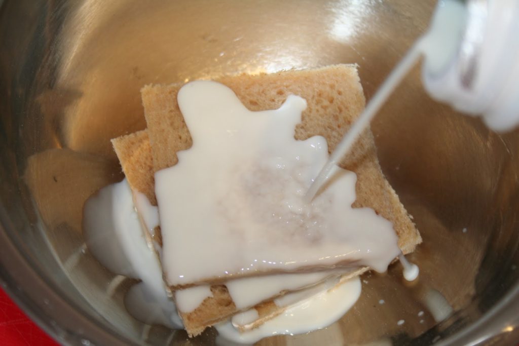 - Commencer par enlever la croûte du pain de mie. J’ai acheté du pain de mie de chez Poilâne, qui a une mie dense et délicieuse. C’est beaucoup facile avec une mie bien fraîche. Mettre la mie dans un bol et verser assez de lait pour l’imbiber complétement.