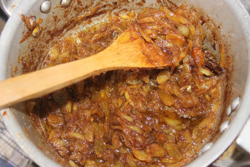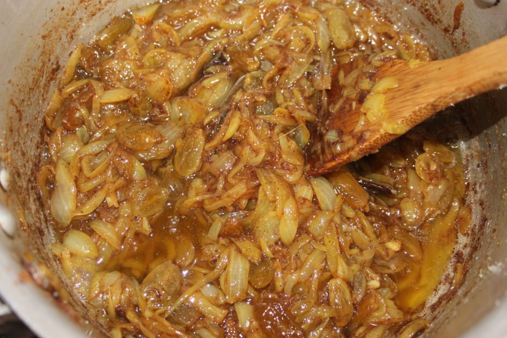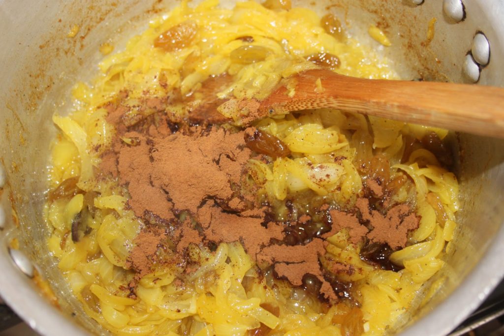- Quand les oignons sont bien cuits (mous au toucher), ajouter les raisins et la cannelle en poudre.