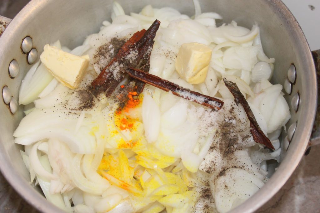 - Ajouter le beurre, l’huile, les bâtons de cannelle, le sel, le poivre et le cube de safran.