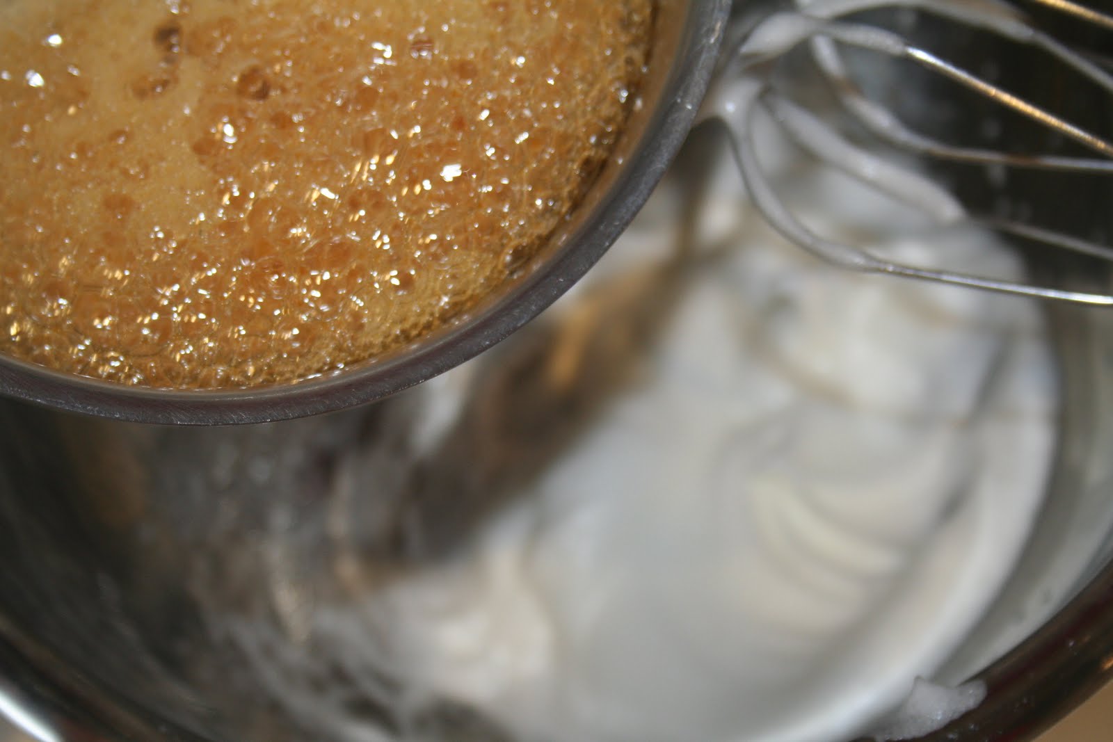 - Quand le sucre atteint 150°C (ce qui n’est pas le cas sur la photo!), le verser également en filet sur le blanc mielé toujours en fouettant!