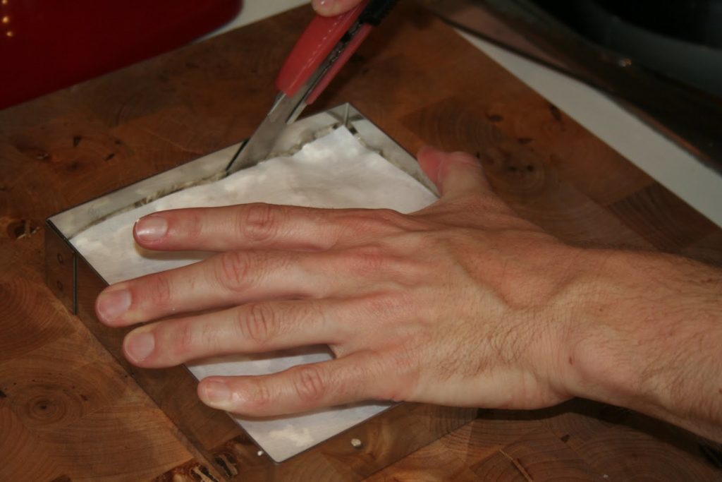 - J’ai préparé mon touron dans un cadre de 16X16cm. Pré-découper les feuilles de pain azyme à la dimension interne du cadre! Avec une règle et un cutter c’est très simple!